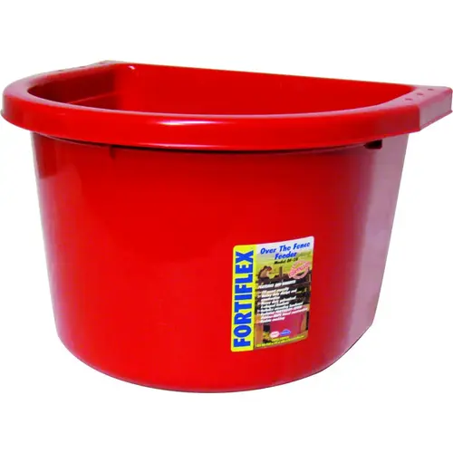 Innovative and practical over-the-fence and on-the-wall feeder with multi-adjustable heavy-duty galvanized L-shape brackets. Adaptable to most stable feeding needs. 20 qt capacity with decorative medallion and etched horsehead. heavy-duty design and construction. Capacity markings in gallons and liters.