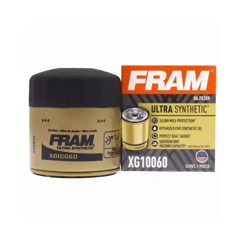 Fram XG10060 ultra synthetic oil filter. Engineered for drivers who are looking for ultimate performance and engine protection. Its dual-layered synthetic blend media provides 99%+ filtering efficiency and protects up to 20,000 miles. The silicone anti-drain back valve ensures safe engine startups, extending the life of the oil filter. Provides a non-slip surface allowing for easy install and removal.