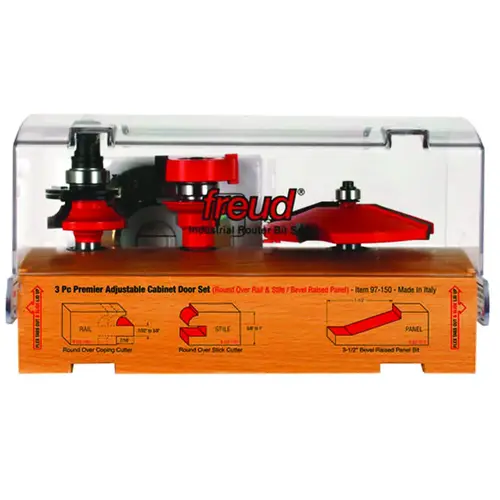 3-piece premier adjustable cabinet bit set. Designed to be used on 5/8 in to 1-1/4 in stock. Includes attractive wooden storage box. Cuts all composition materials, plywood, hardwoods and softwoods. Use on table-mounted portable routers with 1/2 in shank.