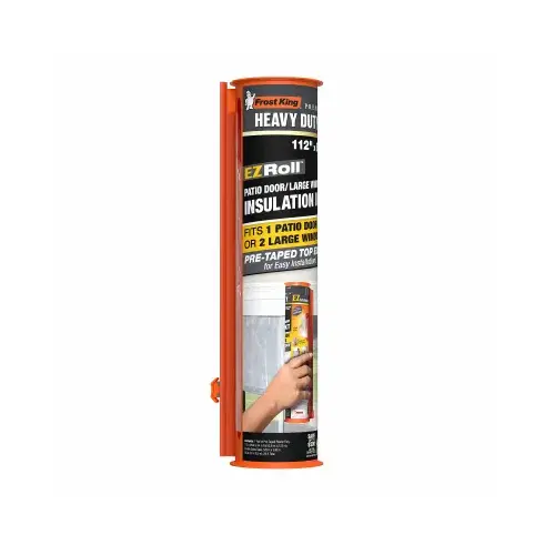 E-Z roll on patio door insulation kit in dispenser with premium, heavy-duty film. Rolled film has pre-taped top edge and built-in trimmer for easy installation. 112-in. x 84-in. crystal clear film, fits 1 patio door or 2 large windows.