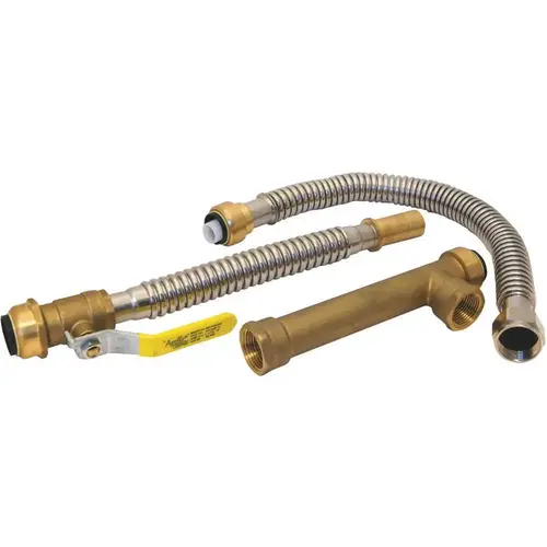 The Tectite by Apollo Water Heater Installation Kit with TankTee is the fastest, simplest and cleanest method by which to install a water heater with an expansion tank. With thread tape applied to water heater nipples, screw the TankTee to the cold water inlet and the 18 in. Corrugated Stainless Steel to the hot water outlet. After applying thread tape to the nipple on the expansion tank, screw the expansion tank into the threaded outlet of the TankTee and insert the 12 in. Corrugated Stainless Steel connector with brass insert into the top of the TankTee. Finally, make the final connections to the existing piping system utilizing the Push-To-Connect ends of the connectors. It is fast, simple and clean to install. Tectite by Apollo push-to-connect products are the cleanest and simplest way to gain flow control on copper, CPVC, PE-RT and PEX pipe without the use of tools, solder, open flame or glue. Simply insert the pipe to allow the high-strength stainless steel teeth to grip the pipe securely against the specially designed O-ring. Stop valve removal and reuse is just as simple using a simple demount clip (sold separately). After assembly, fittings may be rotated for simpler installation in tight spaces. All Tectite by Apollo products are approved for use in both potable water and hydronic heating piping systems.