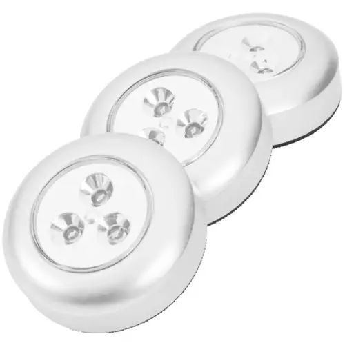 Mounts anywhere, adhesive backing. 13.5 Lumens. Tapping the center of the light turns it On/Off. Uses 3 AAA batteries (not included).