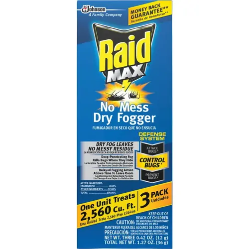 Raid Fumigator creates a deep-penetrating fog that flushes bugs out from where they hide and kills them on contact. When activated it fills the room with a dry, white cloud of fog. Safe for pets and people to return 3 hours after use. No oily residue and a fresh scent. Ideal for use in kitchens, living areas, garages, attics, basements, and pet areas. 1 unit treats a room of up to 16 Ft. x 20 Ft. 3-pack. Active ingredient: Permethrin.