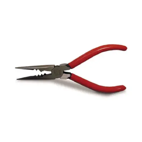 GB Plier, Cutting Capacity: 1-1/2 in, Jaw Type: Comfortable, High-Leverage, Curved Serrated, Jaw Material: Carbon Steel, Nose Type: Long, Tip Width: 1/4 in, Cushioned Handle, 3-1/2 in L Handle, Handle Color: Red, 6-3/4 in OAL, Cut Material: Aluminum, Brass, Copper, Includes: Cutter and Crimper