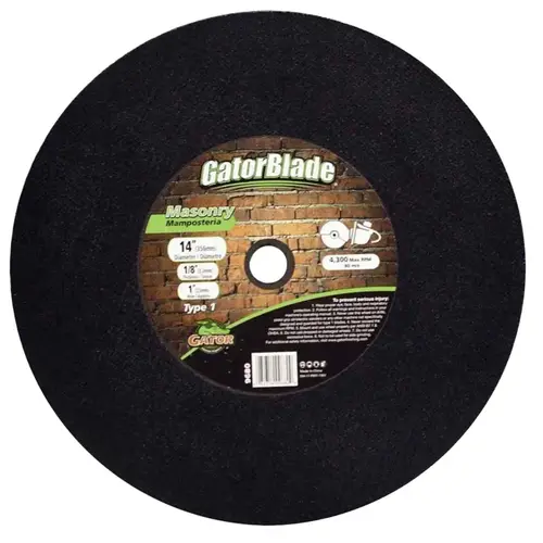 GatorBlade Cut-Off Wheel, Fiberglass Backing, 1 in Arbor, 5,400 rpm Speed, 14 in Diameter, 1/8 in Thickness, Applicable Materials: Masonry, Suitable for: Gas Powered Saw Machine
