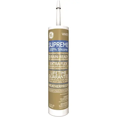 GE Supreme Silicone Window and Door sealant is a 100% waterproof sealant that can provide a reliable seal in weather-prone areas such as windows, doors, basements, roofs, sidewalks, siding, tuckpointing, and attics. Our sealant also has a 30-minute rain-ready formula and resists stain-causing mold and mildew growth. This 100% silicone sealant offers 40% more flexibility than Class 25 sealants and 7X stronger adhesion than our Silicone 1 sealant. Plus, it offers 50% joint-movement capabilities without cracking, shrinking, breaking down, or washing away. GE Supreme Silicone Window and Door sealant has a low odor that's ideal for interior applications, and it won't discolor most high-end metal finishes such as chrome, bronze, and nickel.