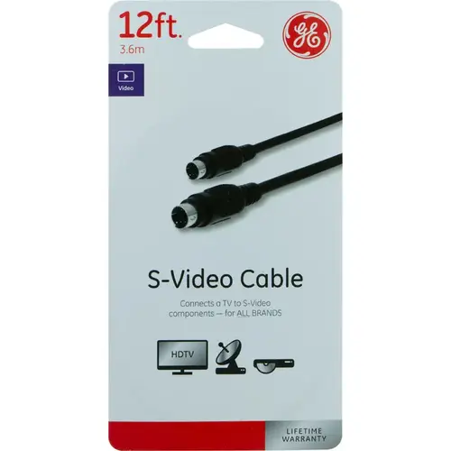 Experience the crisp display of the GE 12 ft. S-video able. TV programs, movies and video games are enjoyed with a clearer picture than offered by standard A/V cables. The S-video cable works with TVs, DVD players, monitors and projectors that have an S-video jack. It is also perfect for keeping your retro devices, like classic gaming systems and VCRs, in use. The 12ft. cable extends reach behind entertainment centers and home theater equipment with ease. The black jacket and ends provide a sleek design to fit into any setup. Durable to withstand regular use for years to come, the S-video cable is double shielded to offer a low-loss video feed and works with any component with S-video connections. The cable is also protected against interference from radio frequency and electromagnetic sources. Get the picture from new or old devices with the GE-branded 12 ft. S-video cable.