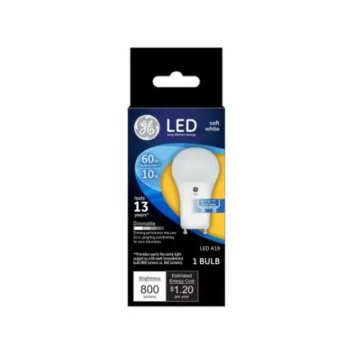 GE LED Bulb, General Purpose, Wattage Rating: 10 W, 120 V, Lamp Base: GU24, Lamp Shape: A19, Lumens: 800 Lumens, Dimmable, Color Rendering Index (CRI): 80, Average Life: 15,000 hr