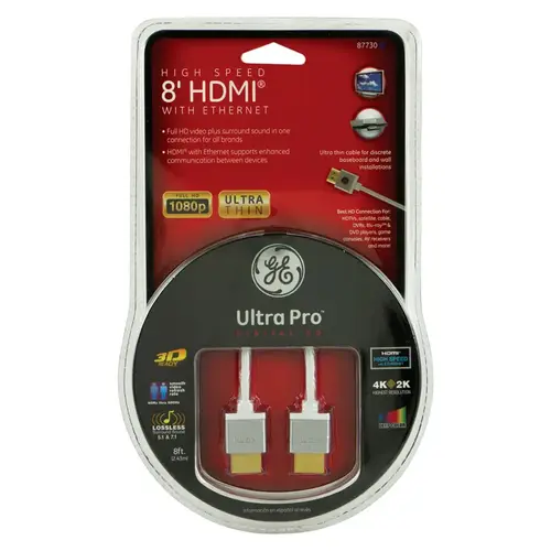 Easily connect your HDMI compatible devices such as HDTVs, DVRs, blu-ray players, game consoles and more with the Ultra Pro series high speed HDMI with ethernet cable from GE. This cable allows you to view video in full HD plus gives you surround sound quality for all brands in one connection. This HDMI cable also supports deep color and is 3D compatible for a superior viewing experience. It also supports Lossless 5.1 and 7.1 surround sound for superior audio and an audio return channel is featured. The HDMI with ethernet feature supports enhanced two way communication. Its ultra slim design makes it perfect for discrete baseboard and wall installations.