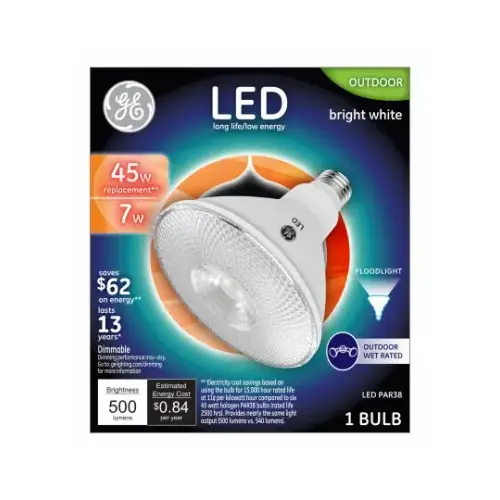 This Ge LED floodlight has 7 watt equivalent to a 45 watt incandescent, PAR38, diffused face, medium base, 3000K color temperature. It is outdoor wet rated, dimmable with a 15,000 Hour Rated Life.