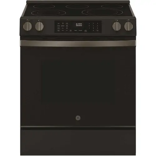 5.3 Cubic Feet Electric Convection Ranwith No Preheat Air Fry Black SlateAssembled Dimensions: D 28.625 In. X H 37.125 In. X W 30 In.5.3 cu. Ft oven capacity with 6 rack positions and 2 nickel racks which provide a durable design that handles heavy backing dishes with ease..Enjoy a clean and sleek interior that eliminates hard-to-reach areas thanks to a concealed oven element.Steam Cleaning and includes the EasyWash Oven Tray. This enameled tray is easily removed and rinsed clean in the sink or, for bigger messes, guaranteed to fit in all Appliances dishwashers.This model features a removable oven storadrawer that offers the perfect place to store cookware and other kitchen accessories.Cook and brown foods more evenly with convection cooking that uses a rear fan to circulate hot air.Built-in Wifi and the SmartHQ app gives you oven control functions like remote preheat, the ability to monitor and chanoven temperature, turn off your oven and more!No preheat air frying is a great way to get crispier versions of your favorite foods in less time.Get food on the table quicker thanks to a fast preheat oven. In just 7 minutes, you have a perfectly preheated oven. Preheats oven in just 7 minutes, bake mode to preheat beep, 350 degrees, one standard rack.Use this power boil burner as a 12-inch or 9-inch element for rapid heat and flexibility on all sized cookware.Mfg #GRS600AVDS