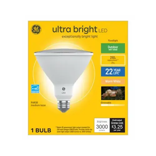 GE, LED32DP38FL/LT, 27W, Warm White Light Color, Frosted Bulb Color, Par38 Shape, Outdoor LED Flood, 32W Replacement Or Equivalent To A 250W Incandescent, 30 Degree Beam, Medium Base, Dimmable, 3,000 Lumens, 2,700 Kelvin Color Temperature, CRI = 80, 22.8 Year, 25,000 Hours Rated Life, MOL: 5.62, Wet Rated, Energy Star Approved, Boxed.