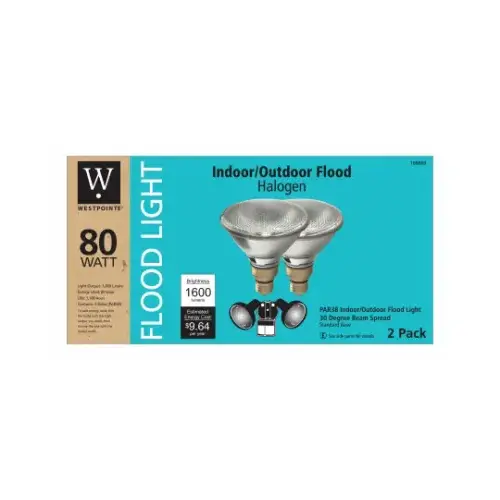 Westpointe, 2 Pack, 80PARH1100F2-TV, 80W, Par38, Indoor/Outdoor, Standard, Halogen Flood Bulb, 1,500 Hour Life, 1,600 Lumens, 2,900 Kelvin Color Temperature.