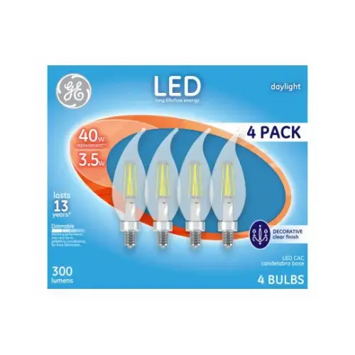 GE, 4 Pack, LED4DCAC-AGC5K-4, 3.5W, Daylight Light Color, Clear Bulb Color, CAC Shape, Decorative LED Light Bulb, Equivalent To A 40W Incandescent, Candelabra Base, Bent Tip, Dimmable, 300 Lumens, 5,000 Kelvin Color Temperature, CRI = 80, 13 Year, 15,000 Hours Rated Life, MOL = 4.20", Energy Star Approved, Boxed.