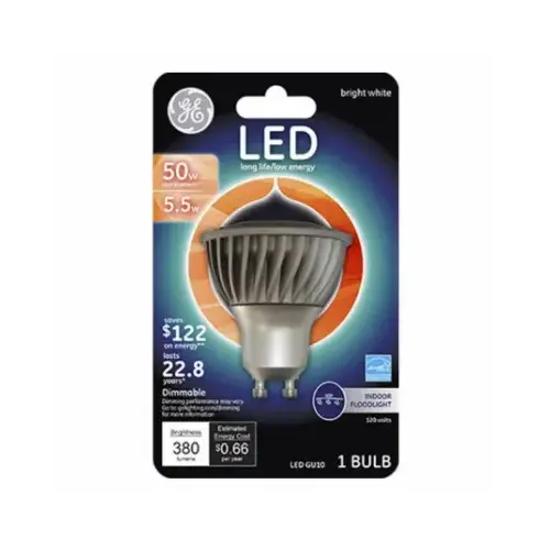 GE, LED6D/GU10/NFL/G8-1, 5.5W, Bright White Light Color, White Bulb Color, MR16 Shape, Flood Light Bulb, 5.5W Equivalent To A 50W Incandescent, 20 Degree Beam, GU10 Base, Dimmable, 385 Lumens, 3,000 Kelvin Color Temperature, CRI = 80, 22 Year, 25,000 Hours Rated Life, MOL = 2.3, Energy Star Approved, Carded. Can be used in enclosed fixtures.