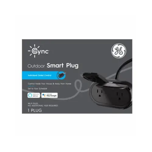 GE, 1PK, CPLGOD2BLG1/ST-1P. Outdoor smart plug that can be controlled inside your house and away from home. Individual outlet control that can be set to your schedule. This is a Wi-Fi plug that requires no additional hub. Works with Alexa and Hey Google. MOL: 7.87". CEC compliant. Cync app only available in the US & Canada - Product can also be connect direct via Google Assist