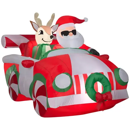 Delight guests and passersby with this Airblown® Inflatable Santa and reindeer in a candy cane roadster. Setup is super simple. Just plug it in, stake it down, and watch the magic unfold. Display this whimsical outdoor decoration as a standalone or combine it with other Airblown® Inflatables to create a custom scene. It's also perfect as an indoor Christmas decoration for parties and celebrations. Includes everything needed for easy outdoor setup.