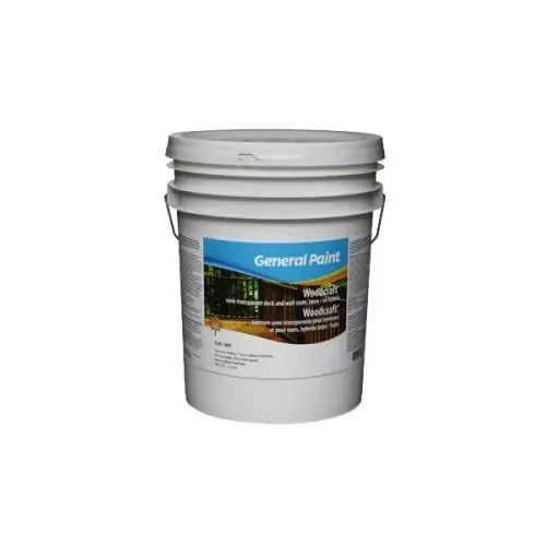 General Paint WOODCRAFT Deck and Wall Stain, Net Content: 5 gal, Liquid, White, Sheen: Semi-Transparent, Compositions: 1-Methyl-2-Pyrrolidone, Heavy Paraffinic Oil, Titanium Dioxide, Viscosity: >20.5 cSt, Pigment Type: Latex, Boiling Point: 212 deg F, Flammability Rating: 0, Specific Gravity: 1.04, Applicable Materials: Wood, pH Range: 9, Base Type: Oil