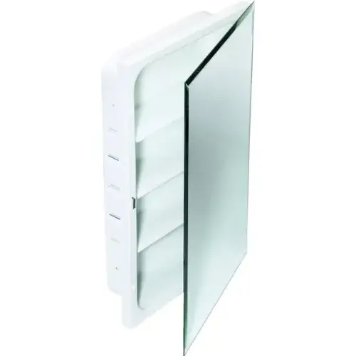 16w X 26"h Recessed Beveled Edge Mirrored Medicine Cabinet With Steel Body. 16w X 26"h. 14W x 24"H Rough-In. White Rust-Resistant Steel Body. Three Adjustable Metal Shelves. Frameless Beveled Edge. White Interior. Mfg #189813