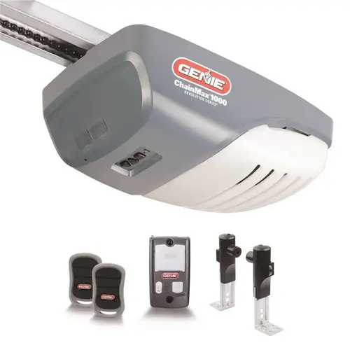 The Genie ChainMax 1000 garage door opener offers a durable 140v DC motor complete with a limited lifetime warranty and the accessories you need. The ChainMax garage door opener features a Genie enclosed C-Channel rail allowing for flush-mounting capability and a clean appearance while ensuring the highest levels of safety and many years of reliable operation. Other safety features include the self-diagnostic GenieSense Technology and the Safe-T-Beam system which helps prevent accidents with an infrared beam of light across the door opening. The DC motor operates powerfully and quietly, with soft start and stop technology, making your door travel smoother. The ChainMax 1000 is also equipped with Intellicode rolling code technology that prevents unauthorized persons from opening your garage door by automatically changing the access code every time you use it. You will also enjoy the added conveniences of 2 pre-programmed 3 button remotes and a wall control panel with an independent light button and vacation lock for added security. The ChainMax 1000 garage door opener is proudly supported by our team of US-based technical support representatives available by phone or chat 6 days a week.