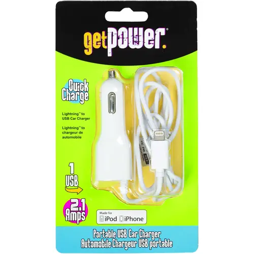USB car adapter. 12 V, USB ports. Works with most portable devices.