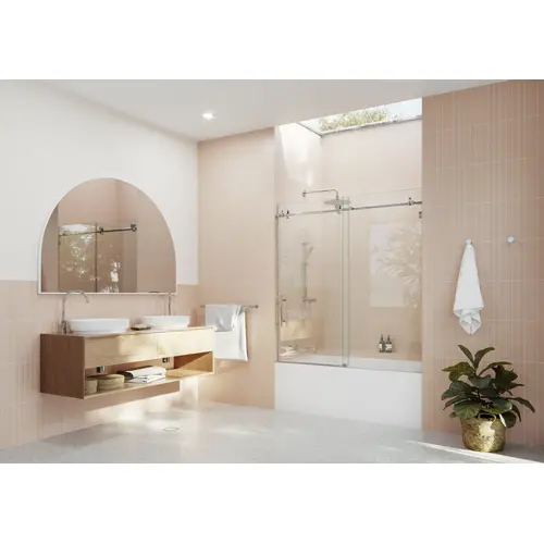 The Eclipse 56" x 60" Fully Frameless Glass Bath Slider offers a sleek, modern design that transforms your bathroom into a luxurious space. With 3/8" (10mm) ANSI certified tempered glass, this frameless shower door provides both durability and style. The roller disc technology ensures smooth, effortless door movement, even with out-of-plumb walls. Available in multiple finishes like Brushed Bronze, Brushed Nickel, Chrome, Matte Black, and Satin Brass, the Eclipse bath slider is the perfect choice for modern bathrooms.