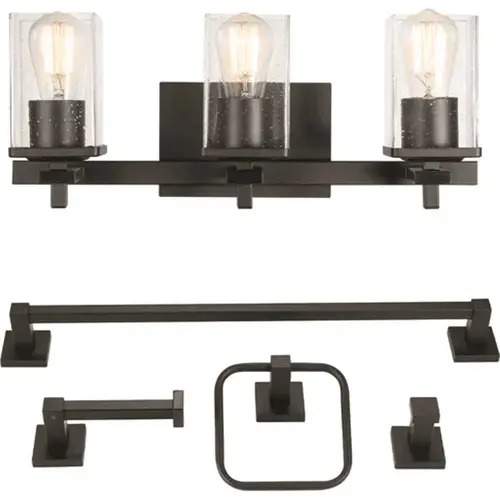 With strong lines paired with vintage accents and a stark matte black finish, the Dakota 5-piece All-In-One Bathroom Set adds an upscale industrial element to any space. The seeded glass and rectangular shades of the vanity light fixture offer a vintage feel while industrial accents complete the look. Update and modernize your bathroom or add the 3-light vanity to your bedroom to create a stunning getting ready nook. Complete with a towel bar, towel ring, robe hook, and toilet paper holder also in matte black, your bathroom will look streamline and welcoming. While the pieces complement each other you can split this set up and use it throughout your home. The towel bar makes an excellent shoe holder. The towel ring would be great in your kitchen. The vanity light would work in your bedroom, bathroom or kitchen. With the ability to use this light as an up-light or a downlight, the options are endless. Unleash your interior designer and think creatively. Think outside the box.