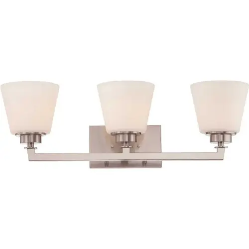 Beautifully finished in brushed nickel and accented by satin white glass, the Nora 3-Light Brushed Nickel Vanity offers timeless styling for many of today's popular design trends. A row of classic shades brightly illuminates your bathroom vanity, creating a versatile centerpiece that coordinates with a variety of decor. Installation is easy with all necessary hardware included.