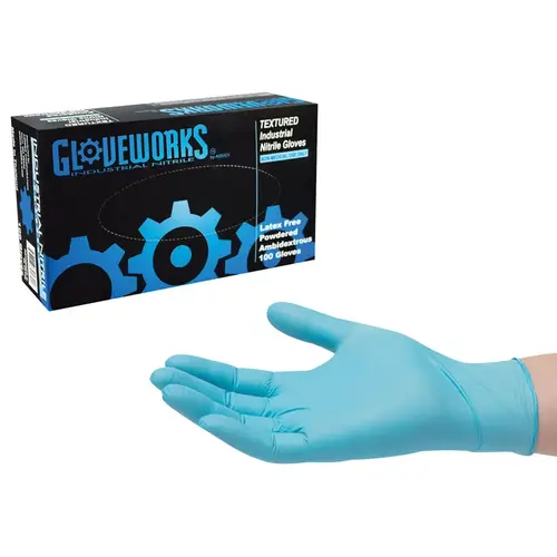You're paid to do a job and you do it well. Your job can be hard on your hands, but hey-that's just the reality of getting the work done. Do right by your hands: Protect them with Ammex Gloveworks blue nitrile powdered industrial gloves. Strength, dexterity, comfort. These premium, industrial-grade nitrile gloves deliver a combination of all three, along with three times the puncture resistance of latex. They're durable-more than 50 percent thicker than standard nitrile gloves-so you won't have to change them as often. Ammex Gloveworks blue nitrile powdered industrial gloves go on and off easily even when your hands are damp, thanks to the food-grade corn starch inside. That makes them perfect for applications from agriculture to printing, janitorial to plumbing. These gloves are 5 mil thick in the palm with 6-mil fingertips. They have a micro-roughened surface with textured fingertips for dependable gripping power. Nearly as elastic as latex, they conform to your hand for a terrific fit. Ammex Gloveworks blue nitrile powdered industrial gloves are the right choice for automotive, industrial, janitorial, food service and safety uses. They're made from component materials that comply with FDA regulations for food contact, which makes them perfect for food processing applications. They have countless uses around the house, too, from plumbing to painting to cleaning. The gloves are latex-free, which means no worries about latex allergy issues. They're available in an extended size range, from small to XXL and sold 100 gloves per box, 10 boxes per case. Protecting yourself must be your top priority. Sure, you can buy cheaper gloves than these-but why would you. Ammex Gloveworks blue nitrile powdered industrial gloves will always keep you covered.