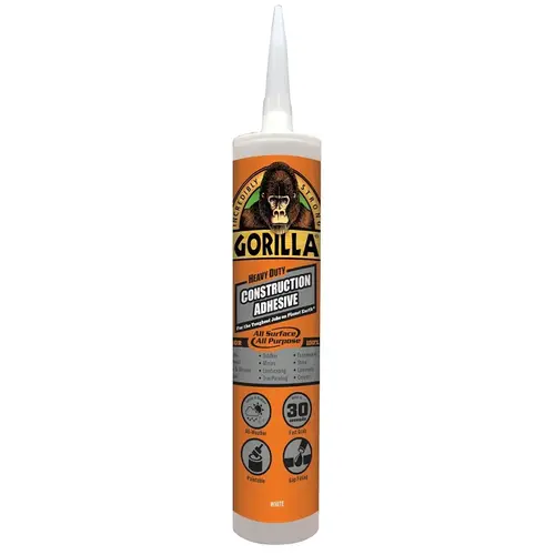 Gorilla heavy-duty construction adhesive is a tough, versatile, all-weather adhesive. The 100% adhesive formula provides a long-lasting, heavy-duty bond. We call it all surface, "All Purpose". The gap-filling, durable, 100% waterproof adhesive formula is perfect for indoor and outdoor projects, holds in 30 sec and bonds virtually anything including subfloor, mirrors, trim, drywall, landscaping, bath surrounds, foamboard, marble and more.
