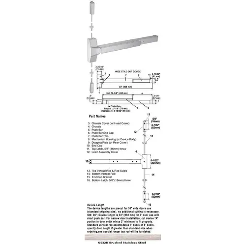 International Door Closers 8830S-36 ANSI Grade 1 Commercial Push Bar Surface Vertical Rod Mount Panic Hardware. Designed for heavy traffic applications. Suitable for use with wide stile (minimum 4-1/4") or flat surface aluminum, hollow metal or wood 1-3/4" Thick doors. Non-Handed and Reversible UL and ULC Listed Panic Hardware. Fits single doors 30" - 36" Wide (cut bar to fit) and up to 96" in Height. Hex key dogging. US32D Brushed Stainless Steel Finish.