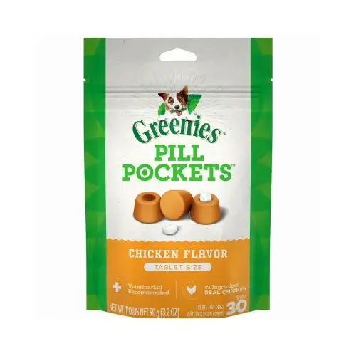 Greenies Pill Pockets 3.2 oz. Chicken Pill Pocket Tablet for Small Dogs are soft and chewy treats that are designed to help hide pills. They are made with real chicken and other wholesome ingredients.