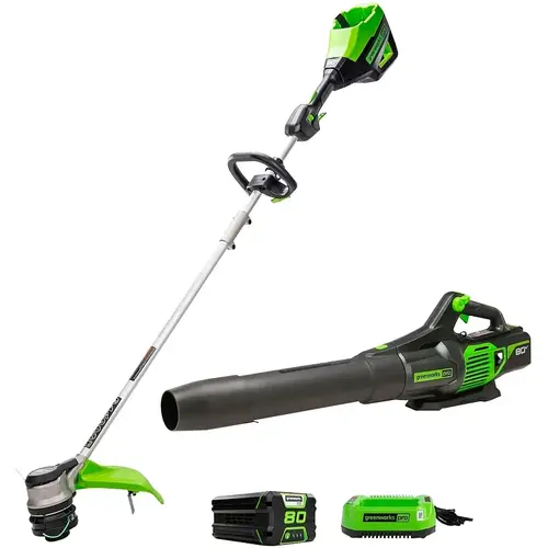 Greenworks 80 V string trimmer and leaf blower combo features a brushless motor. When it comes to outdoor power equipment, you put the emphasis on power. and why not. For homeowners like you who take on jobs big or small, you need heavy-grade construction and long-lasting peak performance. The Greenworks pro 80 V family of tools meet the challenge with a universal battery system that works across multiple products, high-efficiency motors and innovative smart technology. All Greenworks 80 V tools feature a 4 year limited tool and battery warranty.
