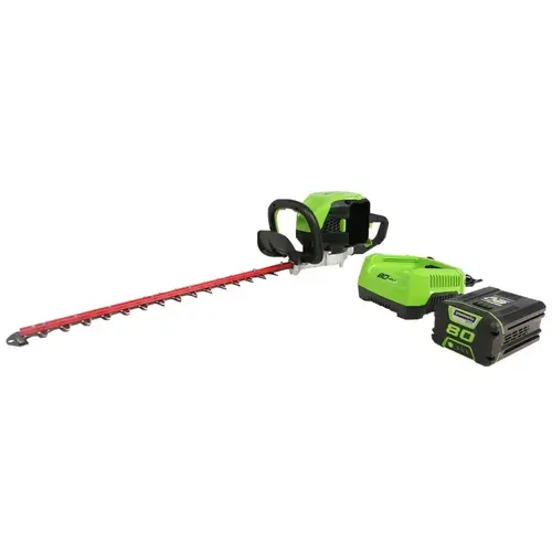 Tackle shrubs, clip bushes and groom your garden. Our 24 in hedge trimmer with a 1.1 in cutting capacity, you can tackle your shrubs, clip tall bushes and groom your overgrown yard garden. This 80 V hedge trimmer provides the power and performance you demand to tackle your toughest shrubbing, hedging and trimming tasks. Dual-action 24 in laser-cut steel blades cut efficiently in both directions for optimal performance and maneuvering. Zero gas smell. Zero pull cords. Zero maintenance. Zero pollution breathed. Zero time wasted.