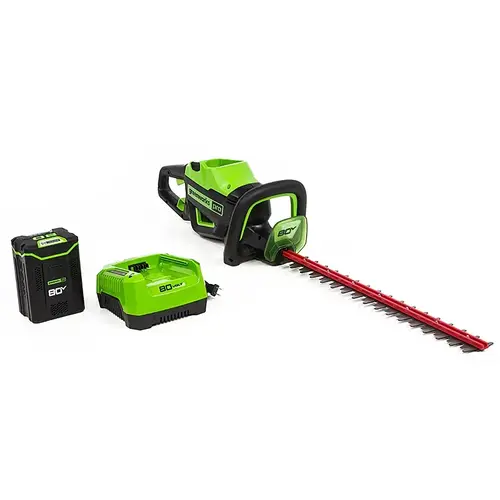 Greenworks Hedge Trimmer, Tool Only/Battery Included: Battery Included, Battery Type: Lithium-Ion, Battery Capacity: 2 Ah, Cutting Capacity: 1.2 in, Number of Head Positions: 7, Dual-Action Blade, 20 in Blade, Steel Blade, Green, Includes: 80 V 20 in Cordless Battery Pole Hedge Trimmer, 2.0 Ah Battery and 4 A Charger
