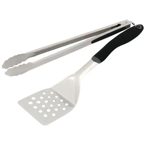 This two-piece set contains an ergonomic stainless turner with black handle and grey accents and a stainless locking tong with soft grip handles.