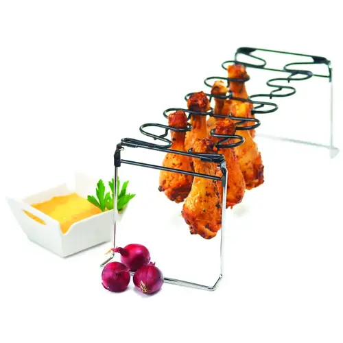 A convenient non-stick coated wire wing rack with folding legs, the ideal way to roast chicken legs and wings on the grill without the hassle of flipping, turning or sticking. For wings and drumsticks.