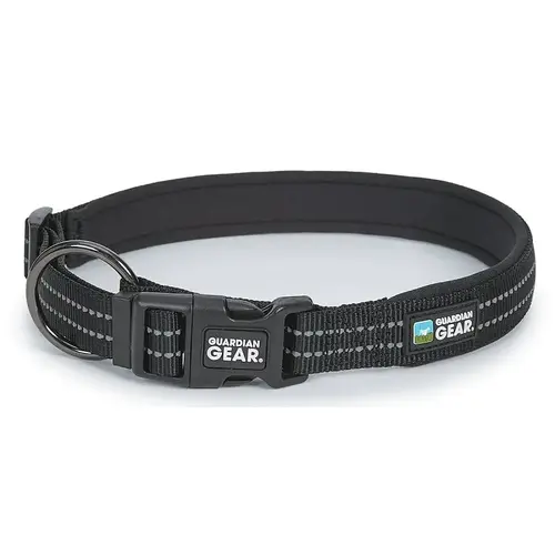 Guardian Gear reflective nylon o-ring collars are constructed with durable high-quality nylon with reflective stitching and high-tensile force plastic fittings. The secure placement of the fully welded O-Ring allows for easy attachment of a leash and is more secure. Made of durable nylon, with full-length reflective tape that lights up brightly in headlights or flashlights. Collars are padded for comfort and adjustable with contoured plastic buckles.