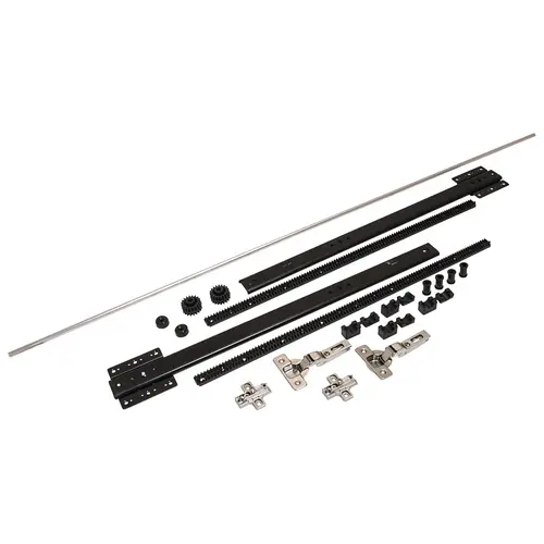 2 ball bearing slides 1 profile rod 43” 2 35 mm hinges 2 mounting plates 2 pinions 4 saddles & bushings 2 racks 2 pivot rollers 8 slide screws (Pan head #8) 12 hinge and rack screws (Flat head #8) 4 hinge mounting plate screws (M4) 8 saddle & bushing screws (M4) 2 pivot roller screws (Raised flat head #6)