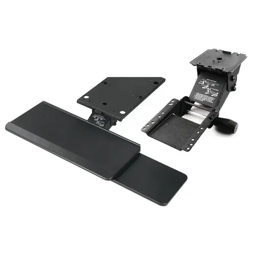 Soft touch knob adjusts both height and tilt simultaneously Spring assisted to help counterbalance keyboard tray weight 360° swivel allows user to move keyboard freely from side to side Low profile ball bearing track