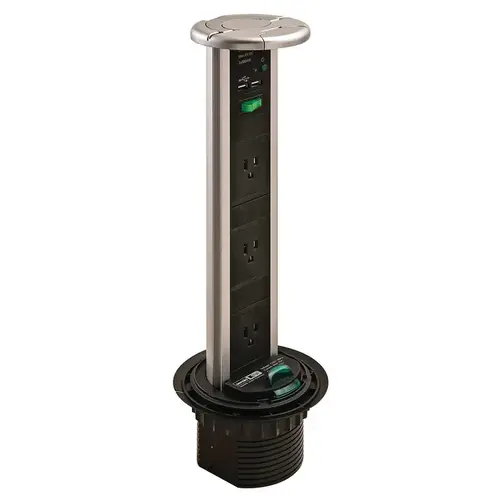 On/Off switch Two USB charging ports 2.0A Three power sockets, 120V - 10A Power cord length: 8' (2438 mm) IP54 Rated - splash proof in retracted position 13 1/4" (337 mm) space required above surfaces and 14 1/2" (362 mm) required below