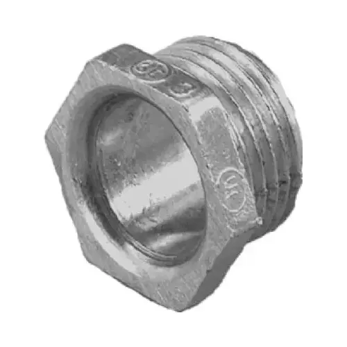 Zinc die-cast. Indoor or outdoor applications. Use to terminate threaded conduit to a knockout box or enclosure, where space within the box is limited. Used with a locknut to provide a short raceway between boxes or enclosures. UL and CSA approved.