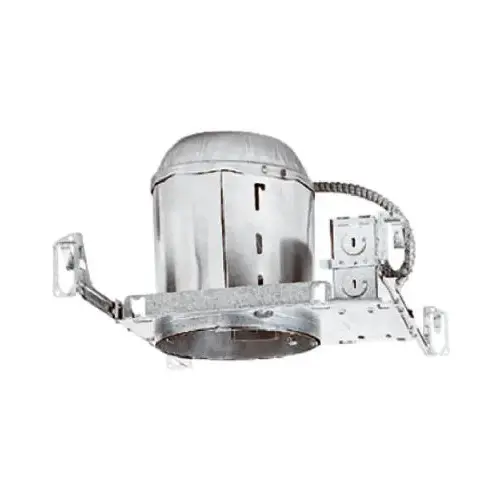 For use with 120 volt Incandescent lamps. Aluminum construction for greater heat dissipation. For installations where housing will be in direct contact with ceiling insulation. Integral thermal protector guards against misuse of insulation materials and improper lamping. Adjustable socket bracket assures proper and consistent lamp positing. Junction box is listed for through branch circuit wiring and has seven 1/2"" knockouts. Slide-N-Slide connectors allow non-metallic sheathed cable to be installed without removing knockouts. Pre-installed captive bar hangers allow housing to be positioned at any point within a 24"" joist span. Can be field shortened for 12"" joist. Installation: 7-1/2"" height allows use in 2 x 8 joist construction. Housing accommodates ceilings up to 2"" thick. Requires 6-1/2"" ceiling opening. Listings: UL Damp Locations. UL Feed Through. UL Listed for direct contact with insulation. CSA Certified. IP Rated.