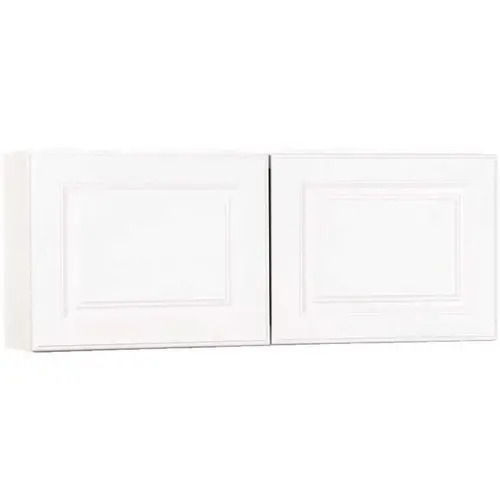 Finished in a lovely satin white color that complements your kitchen decor, the Hampton Bay 36 in. Kitchen Wall Bridge Cabinet has a pocket-screwed face-frame construction that offers long-lasting strength. Equipped with concealed, self-closing hinges, this sturdy cabinet is designed to fit above most refrigerators. The cabinet is assembled and features encapsulated panels for easy installation.