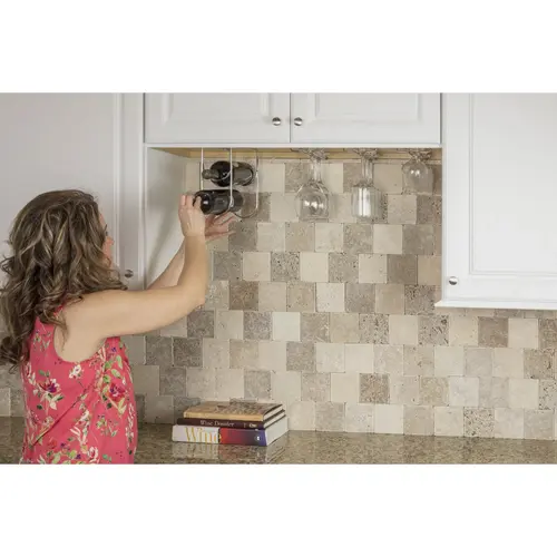 Perfect for storing wine bottles under the upper cabinet. Easily mounts with just four screws. Scoop in the front is designed to hold neck of bottle at the correct angle to ensure wine stays safely stored. Satin Nickel finish. To view available specifications and installation instructions select all product options.
