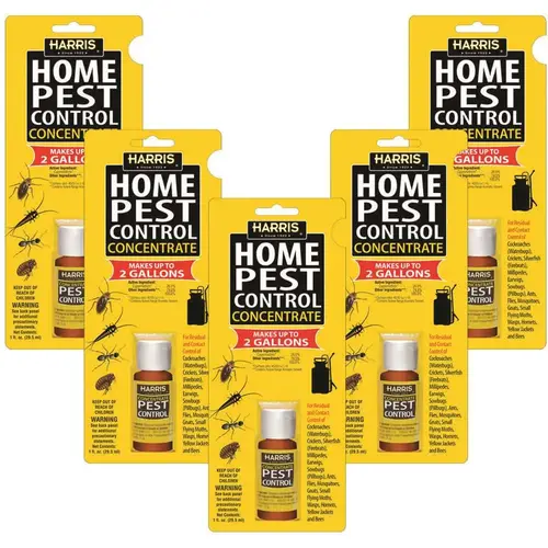 The Harris 1 oz. Pest Control Concentrate (5-Pack) kills on contact and keeps protecting against a variety of household pests like cockroaches, ants, silverfish, spiders, centipedes, millipedes, mosquitoes, crickets, earwigs, fleas and ticks. This 1 oz. bottle of concentrate yields up to 2 Gal. of liquid for your pump-up sprayer (5-Pack makes up to 10 Gal.) Suitable for residential and commercial (indoor and outdoor) sites.