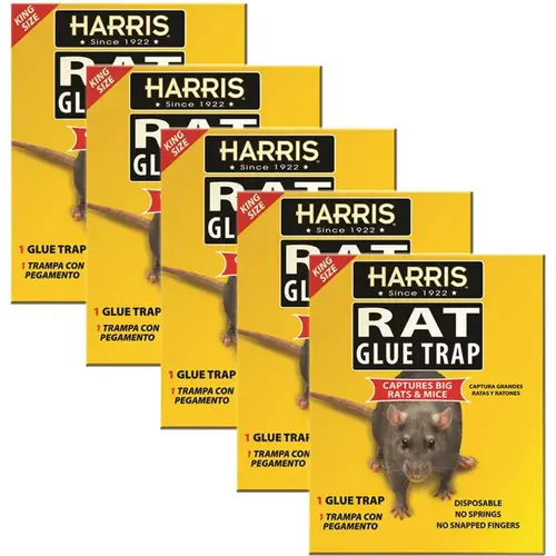 Harris King-Size Rat and Mouse Glue Trap captures big and small rats and mice. Uses No Pesticides or Chemicals of any kind. The Trap opens like a book to double in size. Trap can lay flat or can be placed L shaped against a wall. Rodents are caught by the strong adhesive. The Trap is Non-Toxic and Fully Disposable. Value 5-Pack to treat multiple areas.