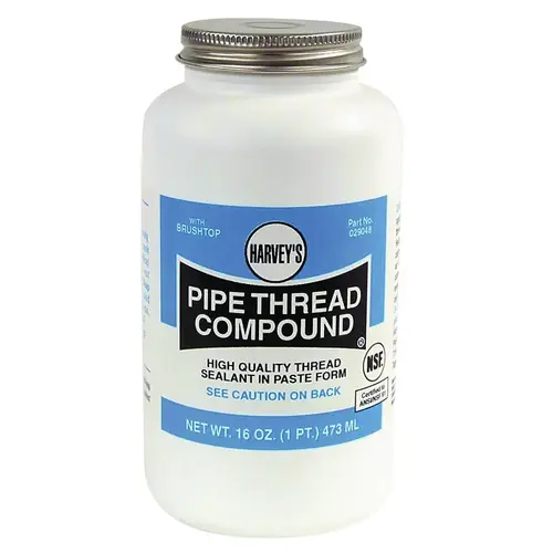 Gray, non-drip paste for pipe joint threads on lines carrying water, steam, air or natural gas. Prevents corrosion to threads. Never hardens, joints separate easily. Contains no lead, non-toxic. Do not apply to plastic threads. Use Harvey TFE Paste or PTFE Tape made of Teflon on plastic threaded joints. Brushtop bottle.