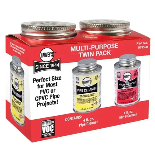 Convenient project pack contains 4 oz all-purpose pipe cleaner and 4 oz multi-purpose solvent cement. For most ABS, PVC or CPVC projects. Twin pack.