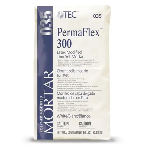 TEC PermaFlex Thin Set Mortar, White (PERMAFLEX-035) is a one-part, polymer-modified thin set mortar designed for reliable bonding of ceramic, porcelain, and natural stone tiles. This 50-pound bag covers 60-70 sq. ft., ideal for pool waterlines and wet areas, offering smooth application and strong adhesion.Specs: 50 lb bag; 60-70 sq. ft. coverage at 1/4" thick; meets ANSI A118.4, A118.11 standards.Compatible with plywood, cement, and tile substrates; suits residential/commercial pool installations.Installation: Mix with water, apply with trowel; tools: mixer, notched trowel; cures in 24 hours.Features: Easy one-step mixing; prolonged pot-life ensures dependable, crack-resistant bonds.